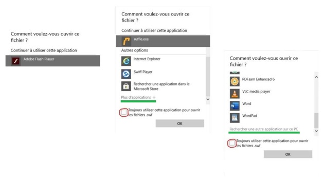 Si vous ne souhaitez pas faire cette manipulation à chaque fois cocher la case "Toujours utiliser cette application pour ouvrir les fichiers .swf"