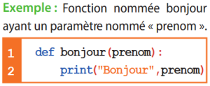 Il est parfois utile d'isoler une partie d'un programme pour pouvoir l'utiliser à n'importe quel moment et autant de fois que souhaité. Il s'agit de sous- programmes appelés « fonctions ». Ces fonctions facilitent l'écriture d'un programme en le rendant moins long et plus lisible. Une fonction[1] est un ensemble d'instructions réutilisables. L'instruction Python « def » suivi du nom de la fonction permet de la définir. |