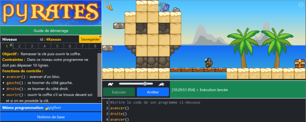 L'application Pyrates (https://py-rates.fr) a été conçue pour accompagner la transition du collège au lycée dans l'apprentissage de la programmation informatique. Une attention particulière a été donnée au passage de la programmation par blocs à la programmation en ligne de code. Cette application est destinée à des élèves de seconde ou de première et vise une première approche de la programmation en Python. Les élèves peuvent l'utiliser en relative autonomie, un effort ayant été fait en ce sens au niveau des contenus et de la progression pédagogique. L'application est, de plus, conforme au RGPD : aucune inscription n'est nécessaire, aucune donnée personnelle n'est collectée. L'élève reçoit un code unique généré aléatoirement pour retrouver sa partie lorsqu'il quitte le jeu. Ainsi Pyrates propose : |