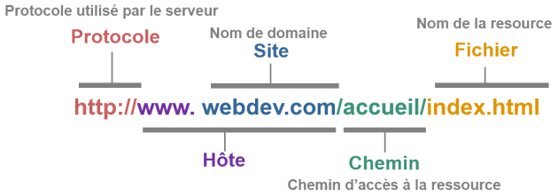 Les sites Web ont une structure en arborescence comme ci-contre. Une ressource (page, photo...) peut se trouver dans un dossier, lui-même situé dans un autre dossier et ainsi de suite.