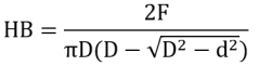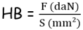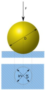 Le poinçon en acier extra-dur est une bille de diamètre D. La dureté Brinell est égale au quotient de la charge d'essai exercée sur la bille par l'aire S (mm²) de l'empreinte, assimilée à une calotte sphérique.