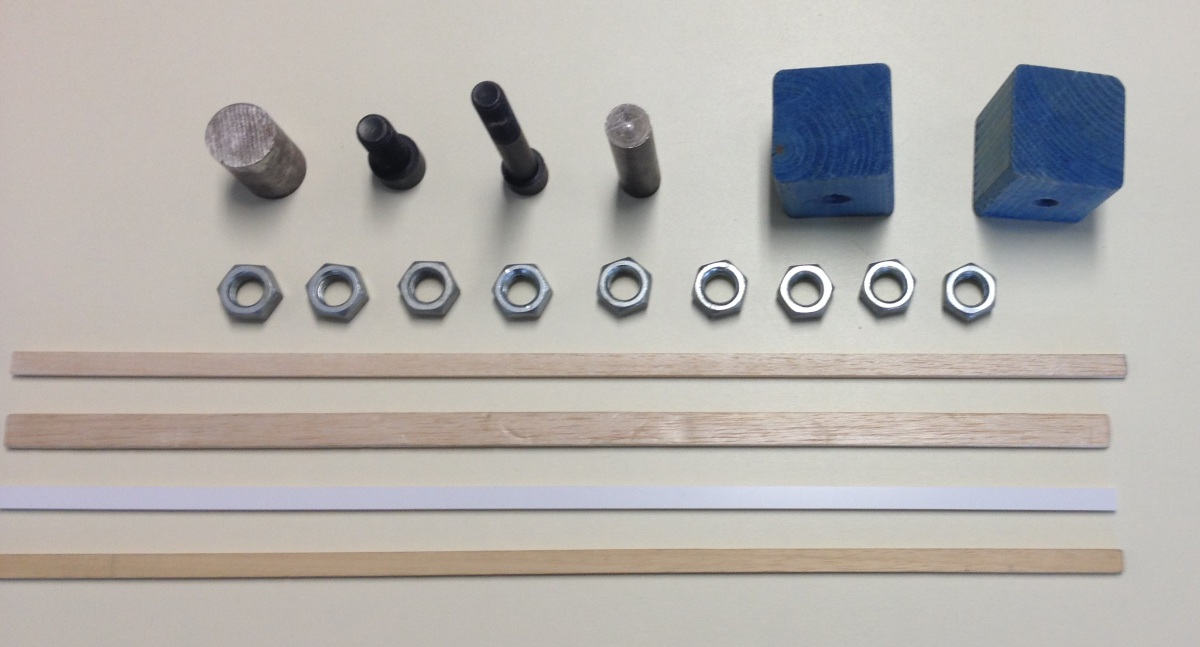 | Deux plots, Une baguette en BALSA de section 5 x 10 mm et de longueur 500 mm, Une baguette en BALSA de section 5 x 15 mm et de longueur 500 mm, Une baguette en SAMBA de section 5 x 10 mm et de longueur 500 mm, Une baguette en PVC de section 5 x 10 mm et de longueur 500 mm, Une masse de 272 g matérialisée par un cylindre de Ø 30 mm et de longueur 50 mm, Une masse de 197 g matérialisée par un cylindre de Ø 20 mm et de longueur 80 mm, Une masse de 135 g matérialisée par une vis longue de longueur sous tête 100 mm, Une masse de 93 g matérialisée par une vis courte de longueur sous tête 40 mm, Neuf écrous de masse totale égale à 272 g.