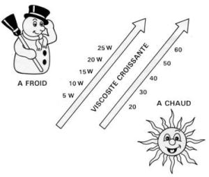 Il fallait donc utiliser une autre huile pour l'hiver, par exemple SAE 20W la lettre « W » signifiant « Winter » (Hiver). A partir des années 1950, les huiles multigrades sont apparues. Une huile multigrade signifie que deux viscosités Hiver et Été (chaud et froid) se rassemblent dans le même produit, par exemple 5W40. |