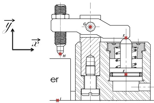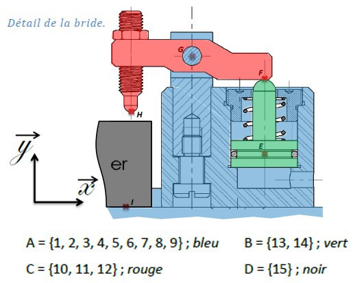 Dans un but de simplification, les classes vont être données dans un premier temps Généralement, et dans un souci de rigueur pour ne pas oublier de pièces, le premier groupe est déterminé à partir de la pièce repérée 1 sur le plan, et les autres groupes à partir du repère suivant non utilisé dans le premier groupe. Pour identifier les classes d'équivalence sur un plan d'ensemble, on associe une couleur pour chaque groupe. A = {1, 2, 3, 4, 5, 6, 7, 8, 9} ; bleu B = {13, 14} ; vert C = {10, 11, 12} ; rouge D = {15} ; noir |