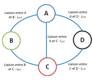 Il faut relier entre elles les classes d'équivalence qui possèdent une, ou plusieurs, liaison en commun en spécifiant le lieu géométrique ainsi que l‘orientation de la liaison. Techniquement cela revient à trouver les couleurs qui sont en contact sur le plan. Nota bene : il faut éviter lorsque cela est possible de croiser les segments représentant les liaisons entre classes. |