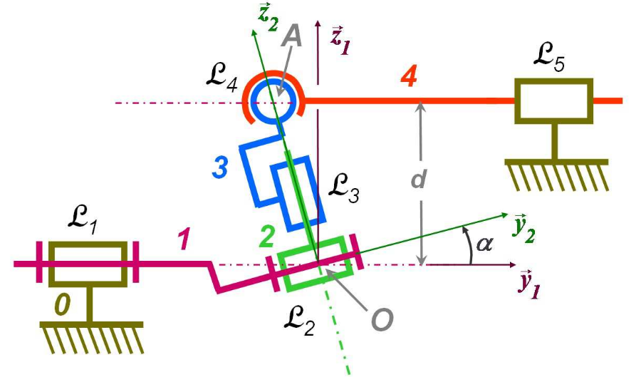 mi = 1 : mobilités du solide 3 qui tourne librement autour des axes (O,z2) mu = 1 : loi entrée/sortie du mécanisme p = 5 : 5 classes d'équivalence Σ ns = somme des inconnues statiques de chaque liaison.