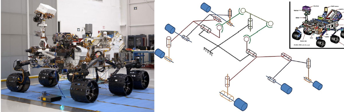 Sonde spatiale ‘'rover curiosity'', mécanisme réel et schéma cinématique spatiale