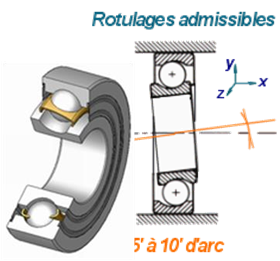 Roulements à billes | Presque toujours utilisé par deux pour réaliser un guidage en rotation. Du fait de l'angle de rotulage, un seul roulement se modélise par une sphérique ou une linéaire annulaire |