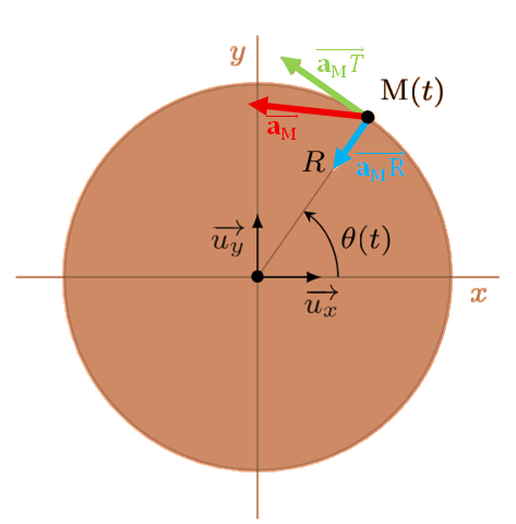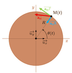 Chaque point M de l'objet a une trajectoire circulaire, donc décrit un cercle de centre O et de rayon R = OM. Le vecteur vitesse instantané est tangent au cercle, donc perpendiculaire au rayon [OM] et change de direction au court du mouvement Le vecteur Accélération M peut donc se décomposer en deux éléments : |