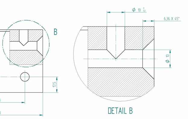 Une vue de détail montre un gros plan de sections spécifiques dans une vue plus grande. Ceci est utile s'il y a des dimensions importantes dans cette petite zone. C'est une bonne vue de la lisibilité des mesures.