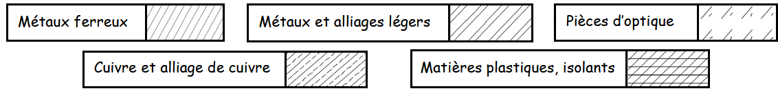 Pour reconnaître plus facilement la famille de matière à laquelle appartient une pièce on emploie des types de hachures spécifiques. Les hachures des catégories de matière que l'on retrouve fréquemment en construction mécanique sont les suivantes :